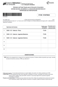 - Original del Certificado de Participación (R.U.S.N.I.E.U.) en el Sistema Nacional de Ingreso. No se permiten copias del certificado, sólo deberá consignar el original descargado de internet y sellado en la oficina de la OPSU. En Carabobo se encuentra ubicada en el sector La Manguita, Zona Educativa, oficina N° 16.
